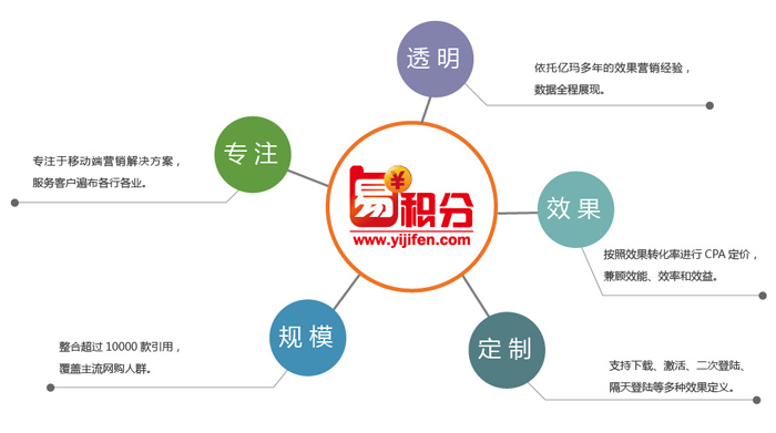 億,可提供應用推薦、原生廣告、O2O廣告、富媒體廣告等多種廣告展現形式。易積分所服務的客戶分布廣泛,涵蓋了超過
